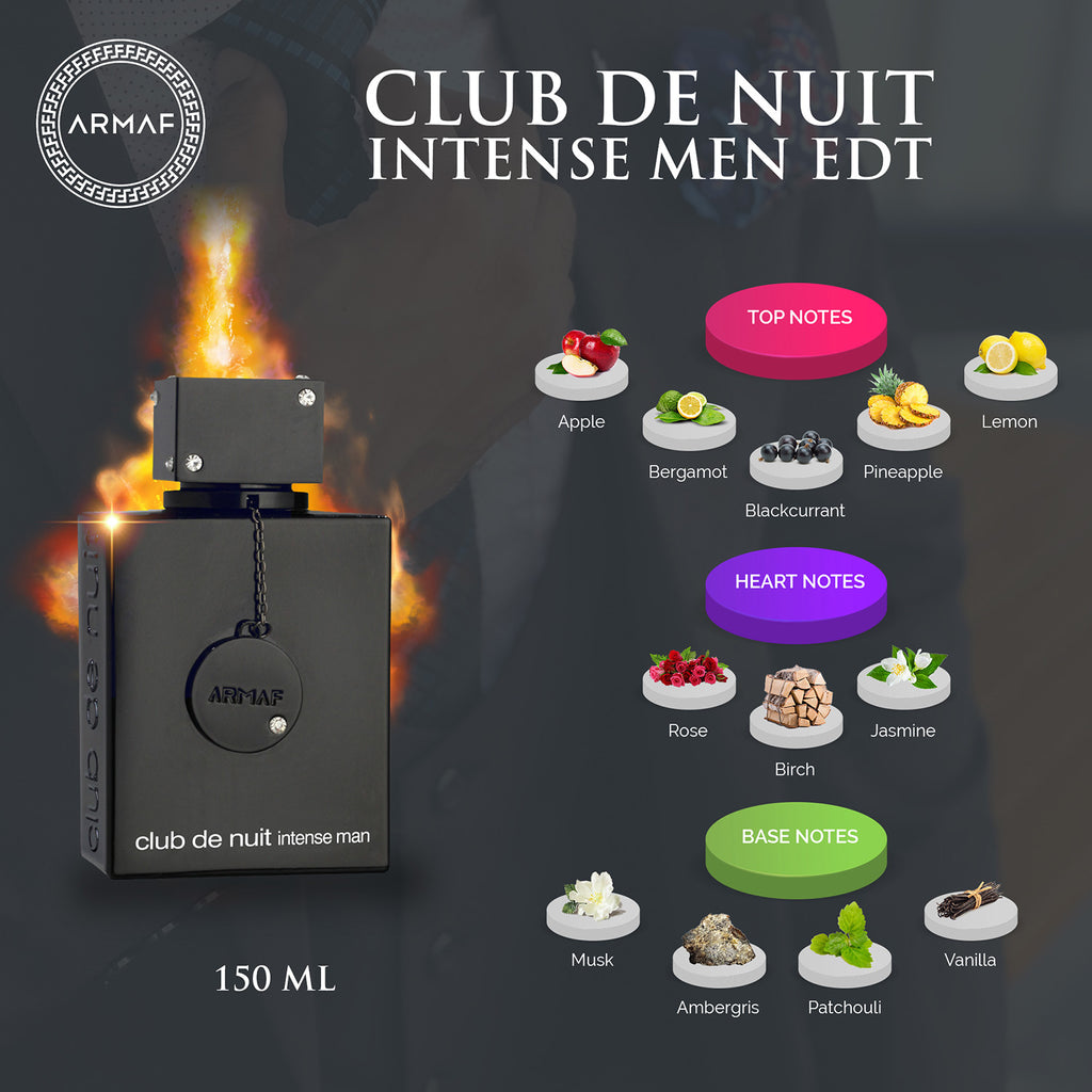 Club De Nuit Intense Cologne by Armaf, Club De Nuit Intense Cologne for men is a captivating blend of fruity accords with a smoldering dry down that gives the impression of a high-end cologne. The top notes of pineapple, bergamot, lemon, black currant, and apple will draw you in with their friendly mix of aromas. The heart notes of rose, jasmine, and birch give this cologne a soft, romantic appeal. Finally, the base notes of vanilla, musk, ambergris, and patchouli provide a finish that is warm and full. This is a magnificent cologne with a scent that is inviting and exciting.