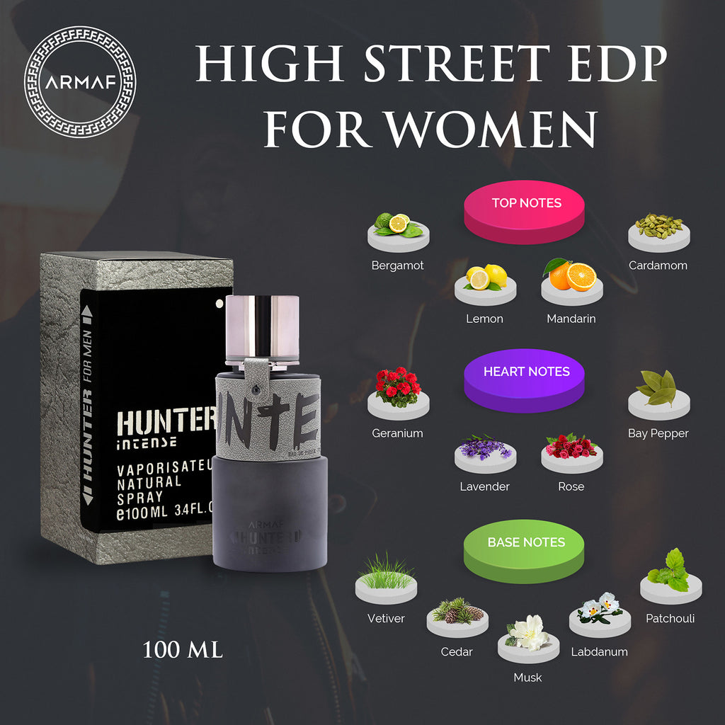 Armaf Hunter Intense Men-This Matchless fragrance opens with natural notes of Bergamot, Lemon, Mandarin, and Cardamom merging with a secretive heart of Geranium, Lavender, Rose, and bay Pepper. The warmth of Cedar and Musk fuses with the magic of Vetiver, Labdanum, and Patchouli to give a dry down and everlasting feel.