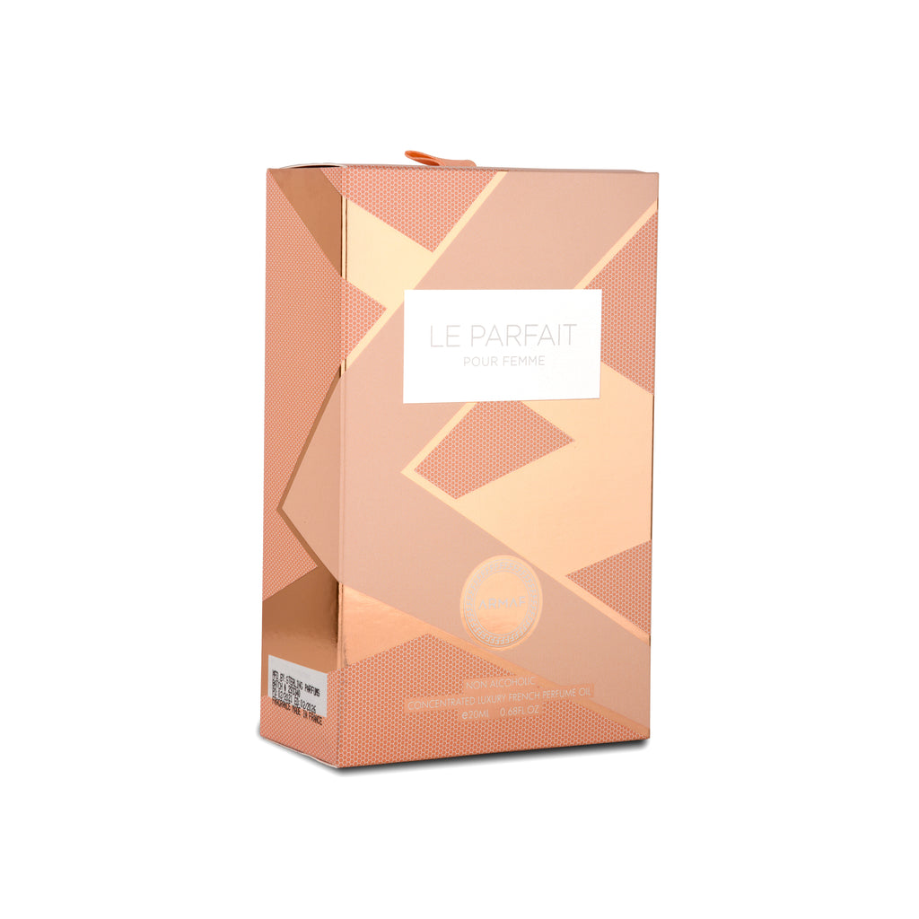 Armaf Le Parfait Pour Femme Oil - Just like an intimate secret, this floral musky scent lingers elegantly. With Neroli, Tuberose, Lily of the valley, Jasmine and Honey suckle layered beautifully on a base of Patchouli, Amber, Musk and Woody notes.