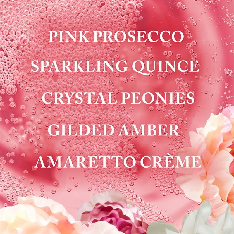 Fragrance Description: A festive blend of pink prosecco, sparkling quince, crystal peonies, gilded amber and amaretto creme