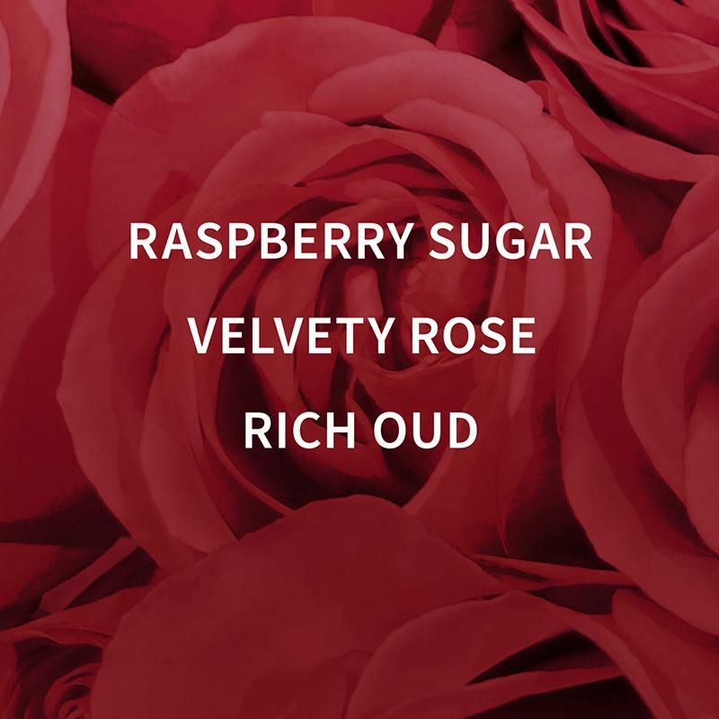 Fragrance Description: Raspberry sugar, velvety rose, rich oud.