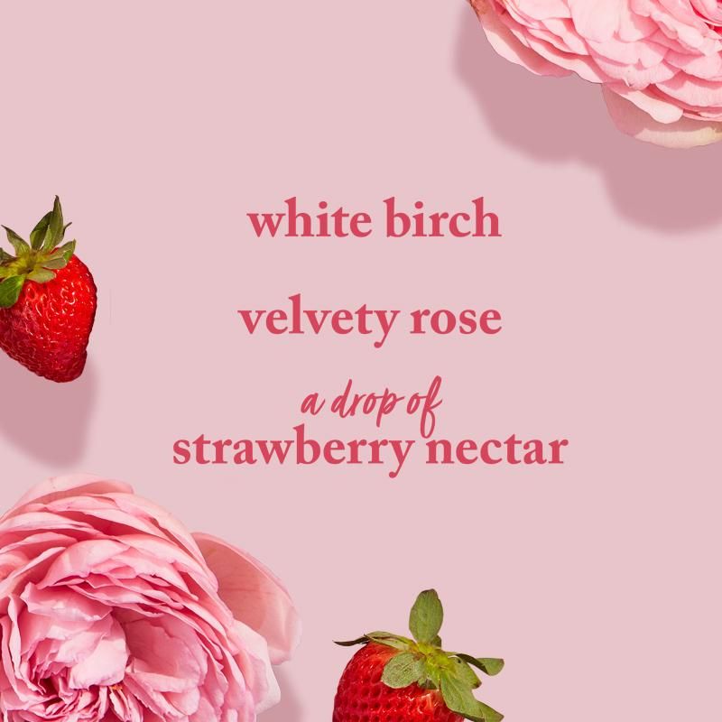 Fragrance Description: A luxurious blend of soft rose, winter birch and a drop of strawberry nectar