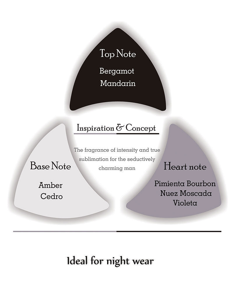 This is a sophisticated scent with a deep sillage that confirms the man's identity and accentuates his singularity. A fragrance that goes beyond and challenges the limits of power and seduction. To last. A fragrance which is a concentrate of intensity and a true sublimation of the original fragrance.